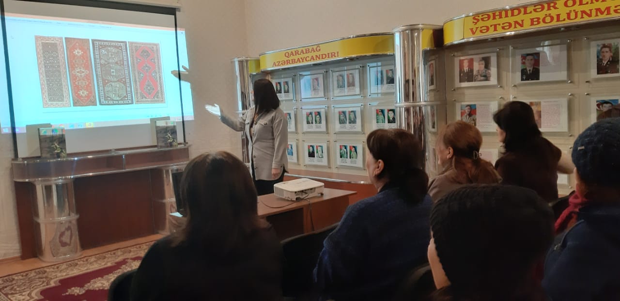 Oxuculara Xidmət şöbəsinin kitabxanaçısı Nuriyeva Sevda çıxış edərək qeyd etdi ki, Şuşa şəhəri tarixən Qarabağın əsas xalçaçılıq mərkəzlərindən biri olmuşdur. Burada xalça toxuculuğu XVIII əsrin ikinci yarısından başlamış, XIX əsrdən isə yüksək inkişaf dövrü keçirmişdir. Toxunan xalçalar xarici ölkələrə də ixrac olunurdu. Xalça tacirlərinin xüsusi marağına səbəb olan bu nümunələr rəng həllinə və kompozisiya quruluşuna görə çox möhtəşəmdir.