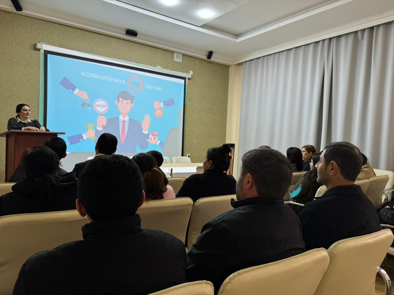 Tədbiri giriş sözü ilə açan Samux rayon Heydər Əliyev Mərkəzinin direktoru Nuranə Həsənova korrupsiyanın cəmiyyətimiz üçün "xərçəng xəstəliyi" nə bənzədərək cəmiyyətin hər bir üzvünün bu mövzuya həssas davranması və bunun kökünü kəsməyə köməklik göstərməsini əsas gətirərək dövlətin bu sahədə apardığı mübarizəyə dəstək olması haqqında danışdı.